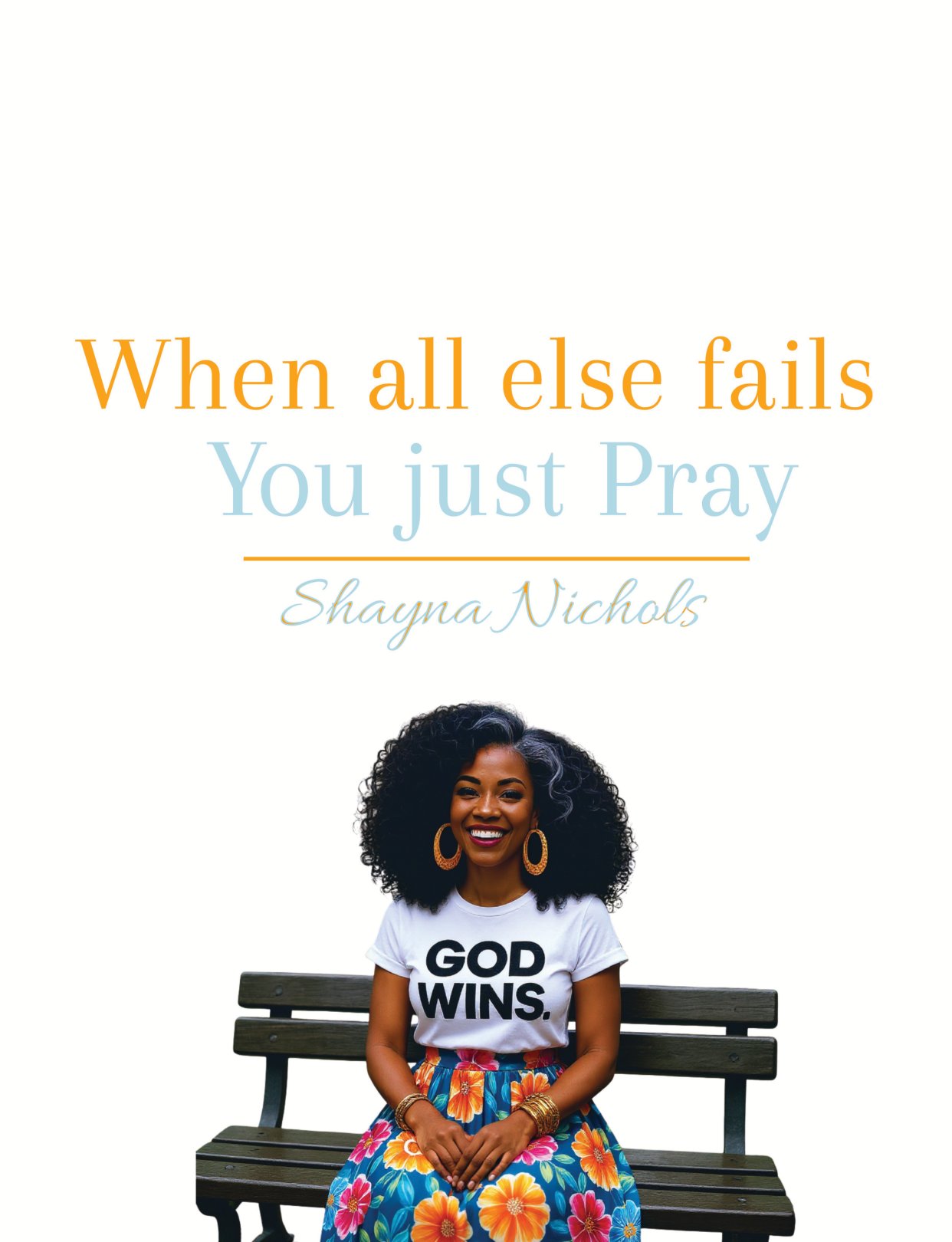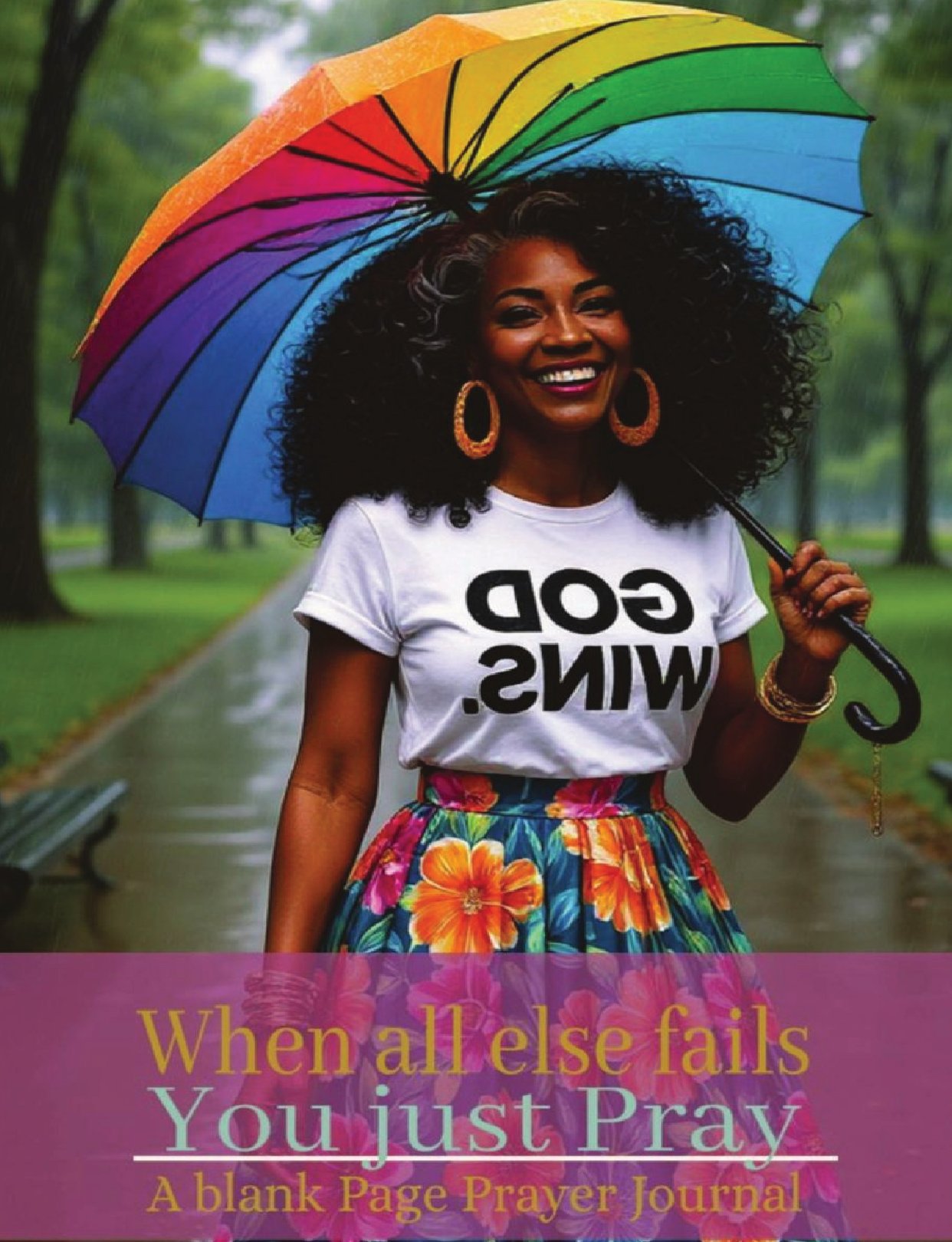 A radiant woman stands confidently under a vibrant rainbow umbrella, her "God Wins" t-shirt proclaiming her unwavering belief. Surrounded by a cheerful floral pattern, this journal is a celebration of faith, resilience, and style—the perfect companion for capturing your thoughts, prayers, and ideas.